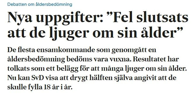 Det anmärkningsvärda är att första meningen efter rubriken är “De flesta ensamkommande som genomgått en åldersbedömning bedöms vara vuxna.” Vilket i praktiken bekräftar att en majoritet inte uppgett korrekt ålder.” I nästa stycke kan man läsa ”Enligt de första resultaten, som presenterades i slutet av maj, bedöms 447 av 581 ensamkommande vara över 18 år.”