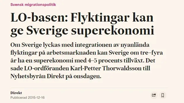 I slutet av december 2015 publicerades en artikel av LO-basen Karl-Petter Thorwaldsson som hävdade att Sverige kunde utvecklas till en superekonomi tack vare det stora flyktingmottagandet. Den la grunden för hur debatten 2016 kom att föras. Debatten handlade fortfarande om ekonomi och hur flyktingar skulle “rädda våra pensioner och välfärd” även om den kritik som nationalekonomen Tino Sanandaji framförde om dessa påståenden började få fart.